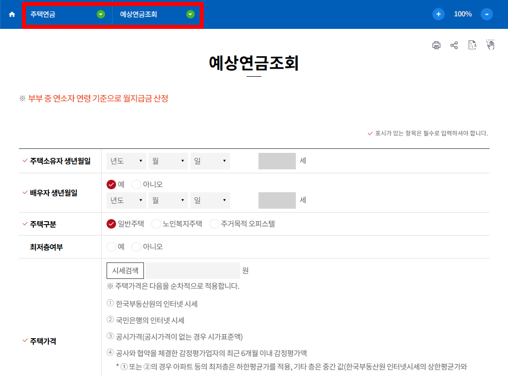 - 홈페이지 상단 메뉴 → 주택연금 → 예상연금 조회